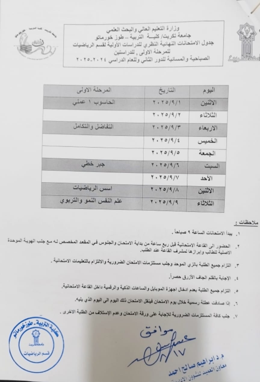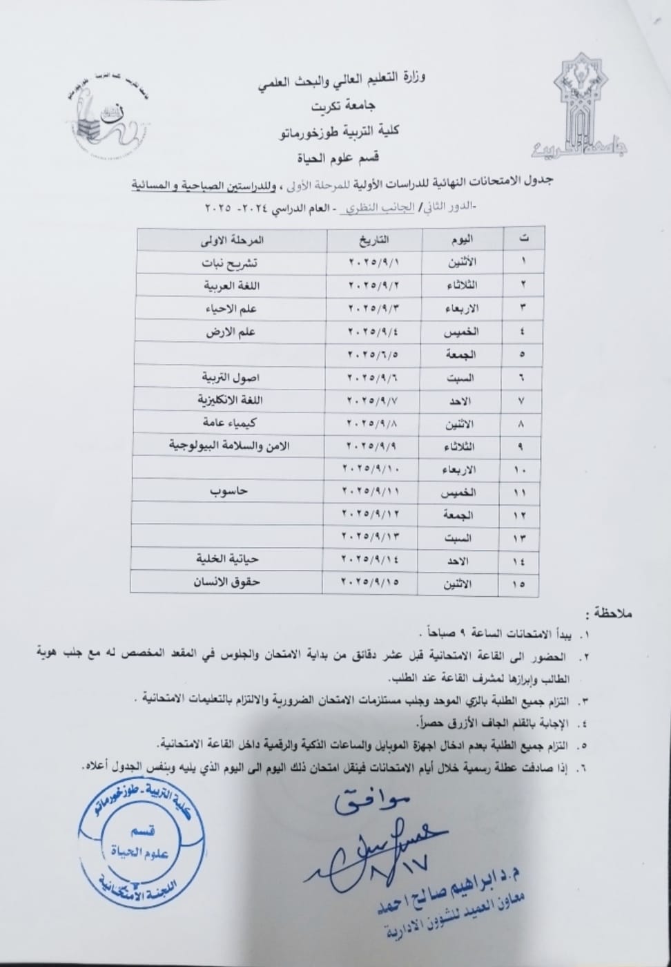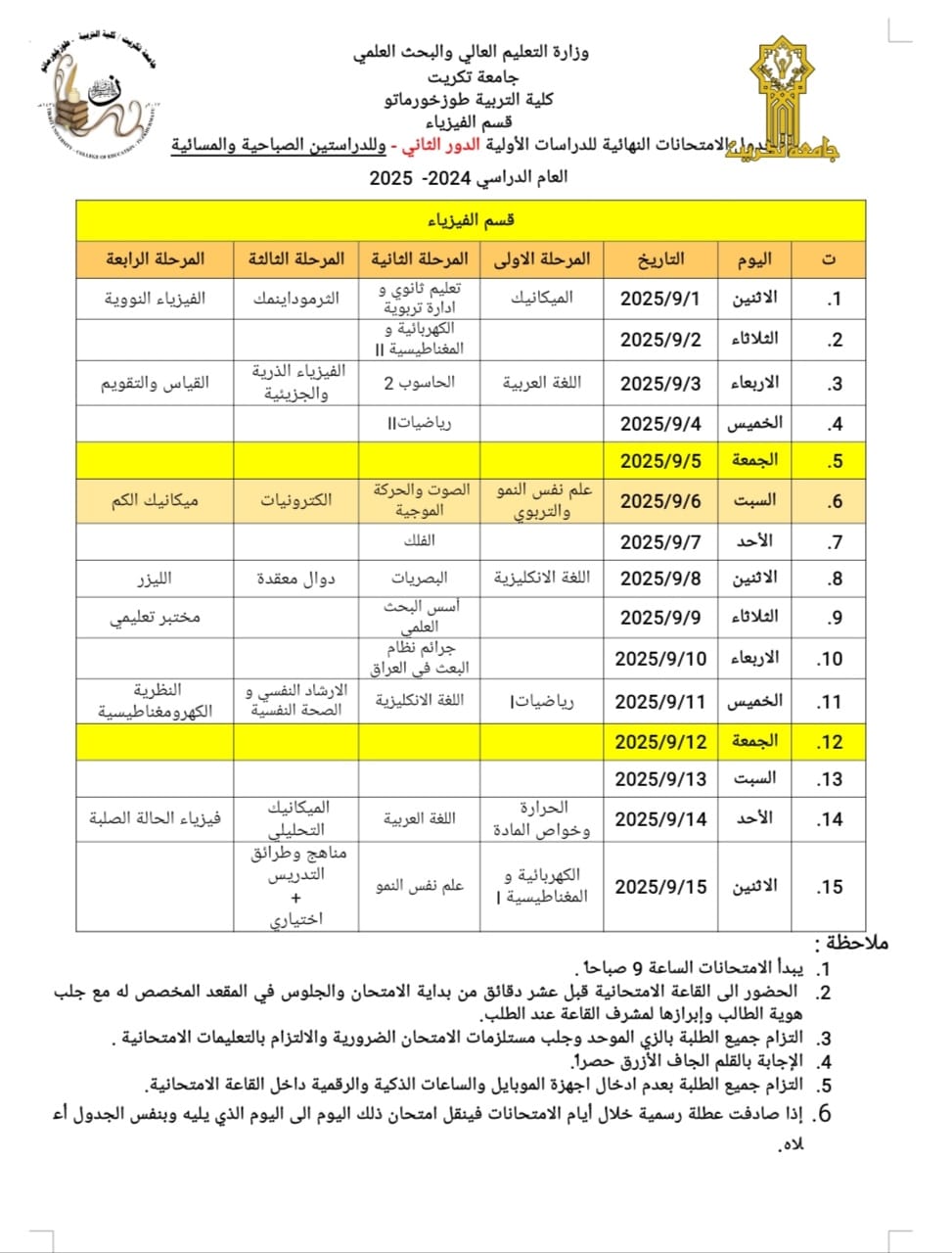 تعلن كلية التربية طوز خورماتو عن جداول الامتحانات النهائية (الدور الثاني) للعام الدراسي 2024 – 2025، وذلك لجميع المراحل والأقسام في الدراستين الصباحية والمسائية.