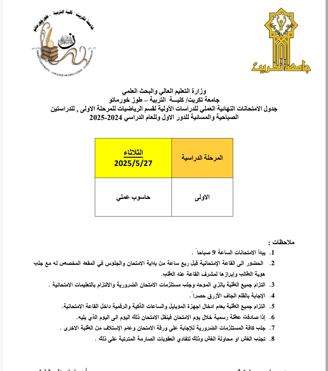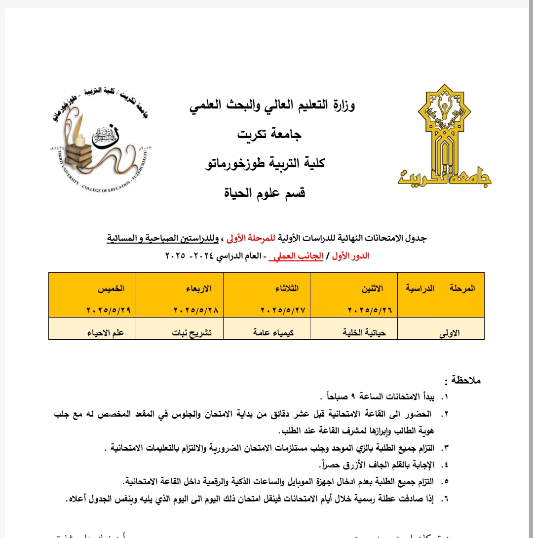 تعلن كلية التربية طوزخورماتو عن جداول الامتحانات النهائية للدور الأول (الجانب العملي) للعام الدراسي2025/2024 للدراستين الصباحية والمسائية.