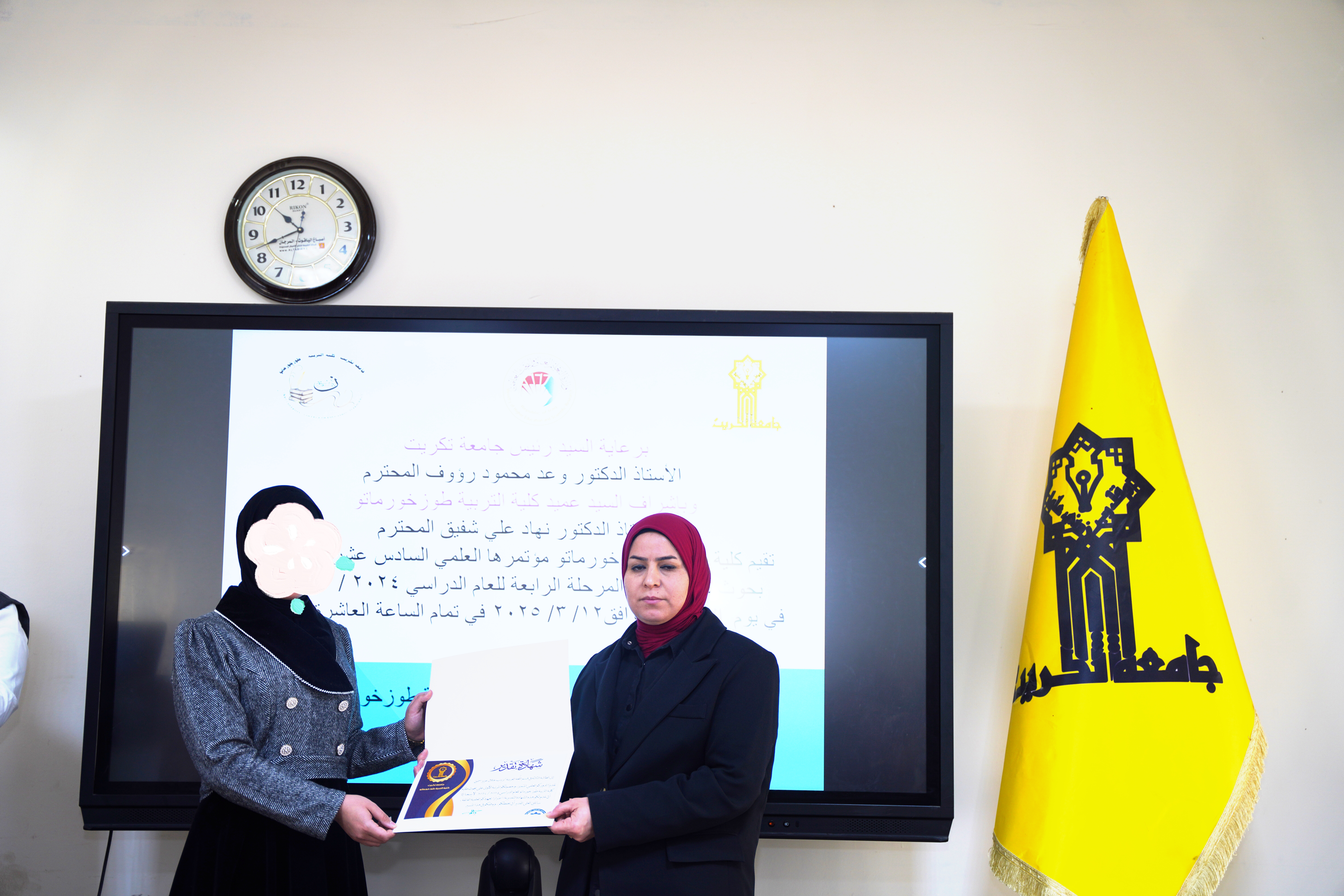 برعاية كريمة من رئيس جامعة تكريت الأستاذ الدكتور وعد محمود رؤوف، وبإشراف مباشر من عميد كلية التربية طوز خورماتو الأستاذ الدكتور نهاد علي شفيق، نظّمت الكلية اليوم الأربعاء الموافق 12 آذار 2025 حفلاً تكريمياً للطلبة أصحاب البحوث العلمية المتميزة في قسمي اللغة العربية والفيزياء.