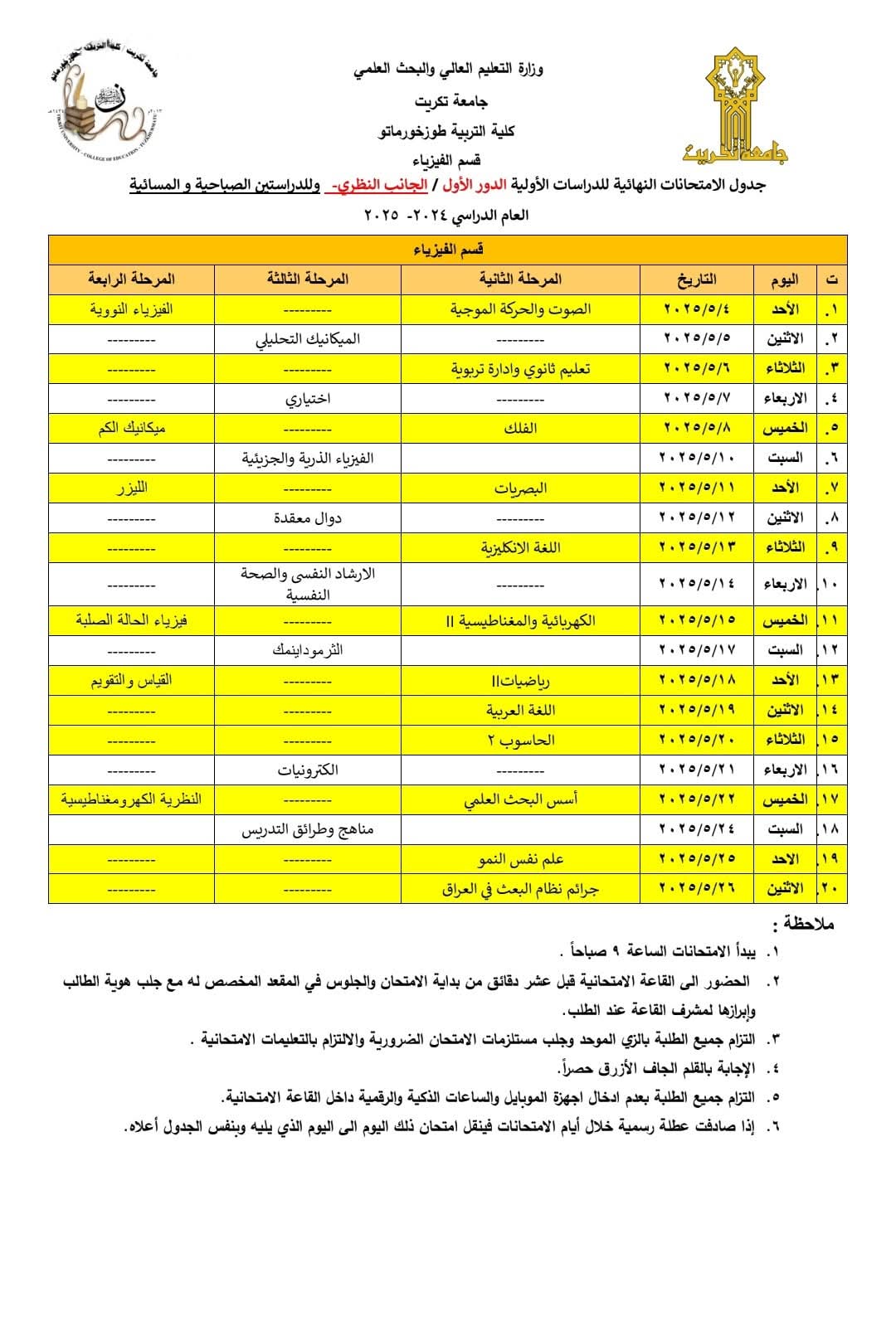 دناه جدولُ الامتحانات النهائية النظرية لطلبة قسم الفيزياء في كلية التربية طوز خورماتو، للمراحل فوق الأولى (الثانية، والثالثة، والرابعة – الصباحية والمسائية)، وذلك ابتداءً من يوم الأحد الموافق 4 / 5 / 2025، ولغاية يوم الإثنين الموافق 26 / 5 / 2025.