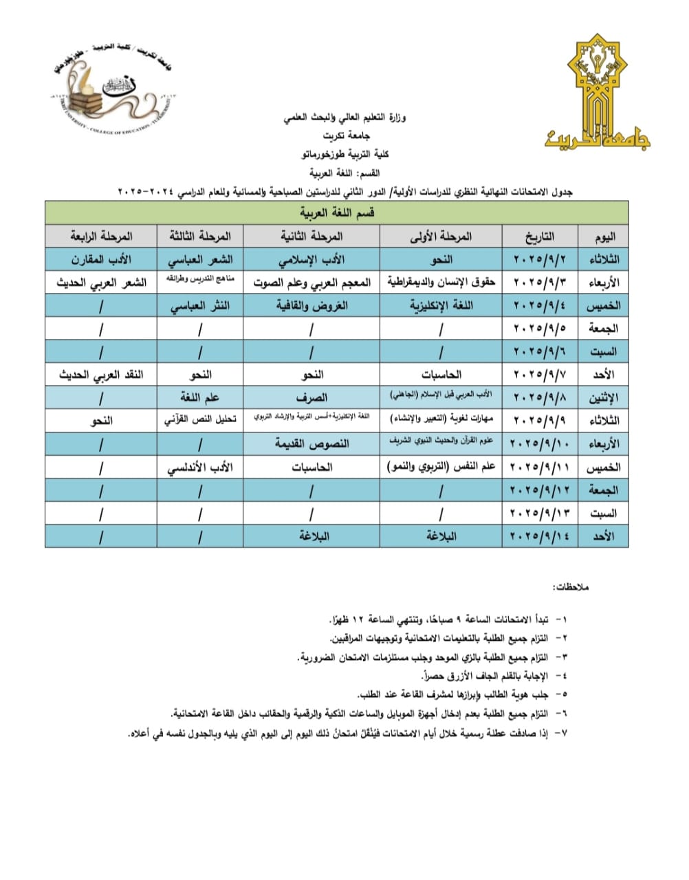 تعلن كلية التربية طوز خورماتو عن جداول الامتحانات النهائية (الدور الثاني) للعام الدراسي 2024 – 2025، وذلك لجميع المراحل والأقسام في الدراستين الصباحية والمسائية.