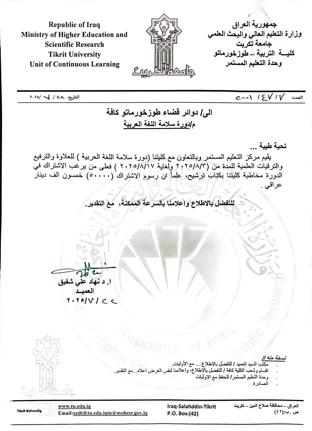 يسر مركز التعليم المستمر في جامعة تكريت، بالتعاون مع وحدة التعليم المستمر في كلية التربية - طوزخورماتو، أن يعلن عن إقامة دورة "سلامة اللغة العربية"