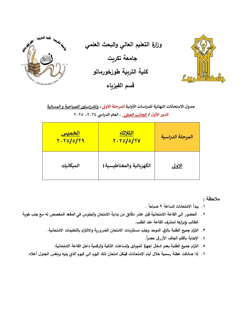 تعلن كلية التربية طوزخورماتو عن جداول الامتحانات النهائية للدور الأول (الجانب العملي) للعام الدراسي2025/2024 للدراستين الصباحية والمسائية.