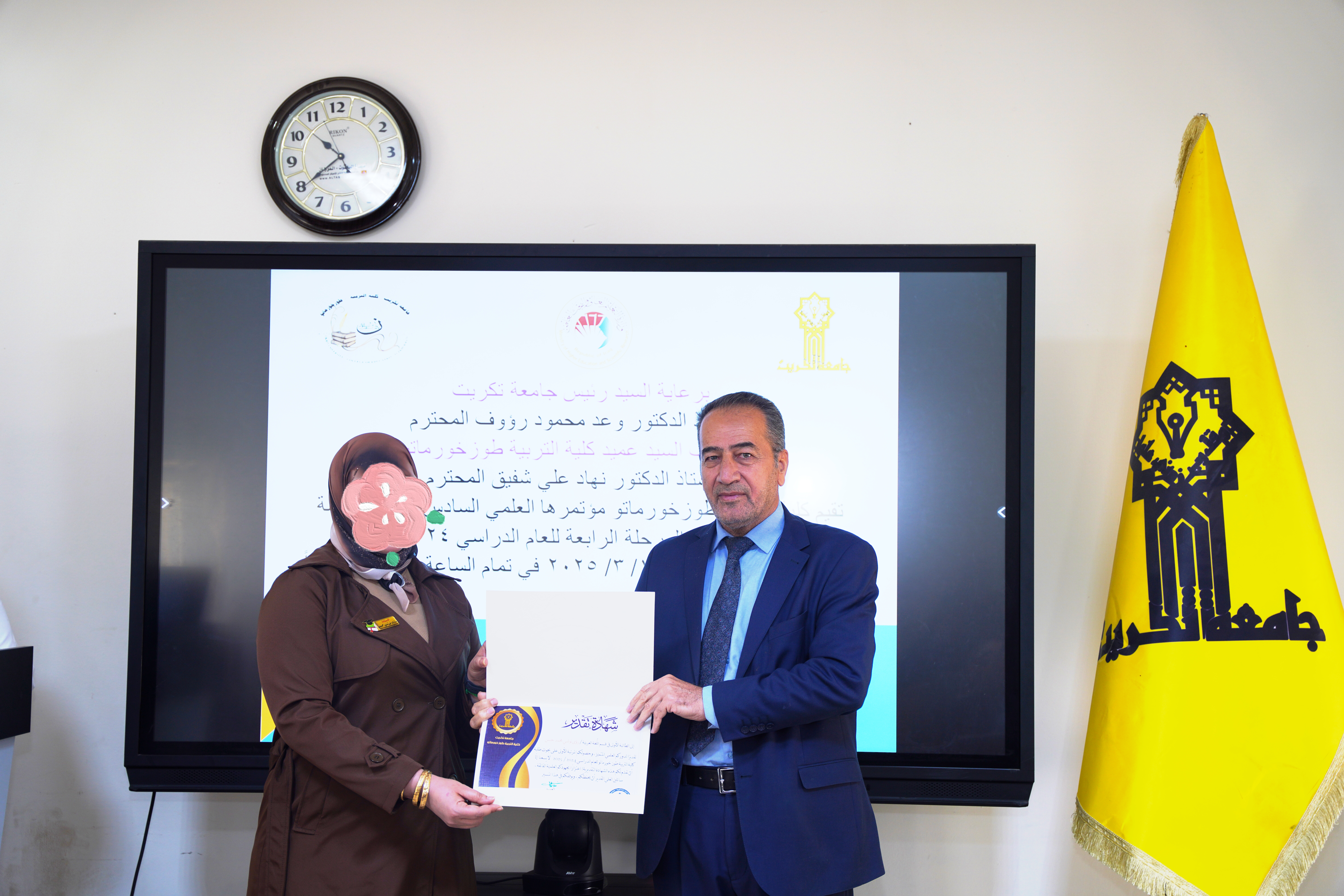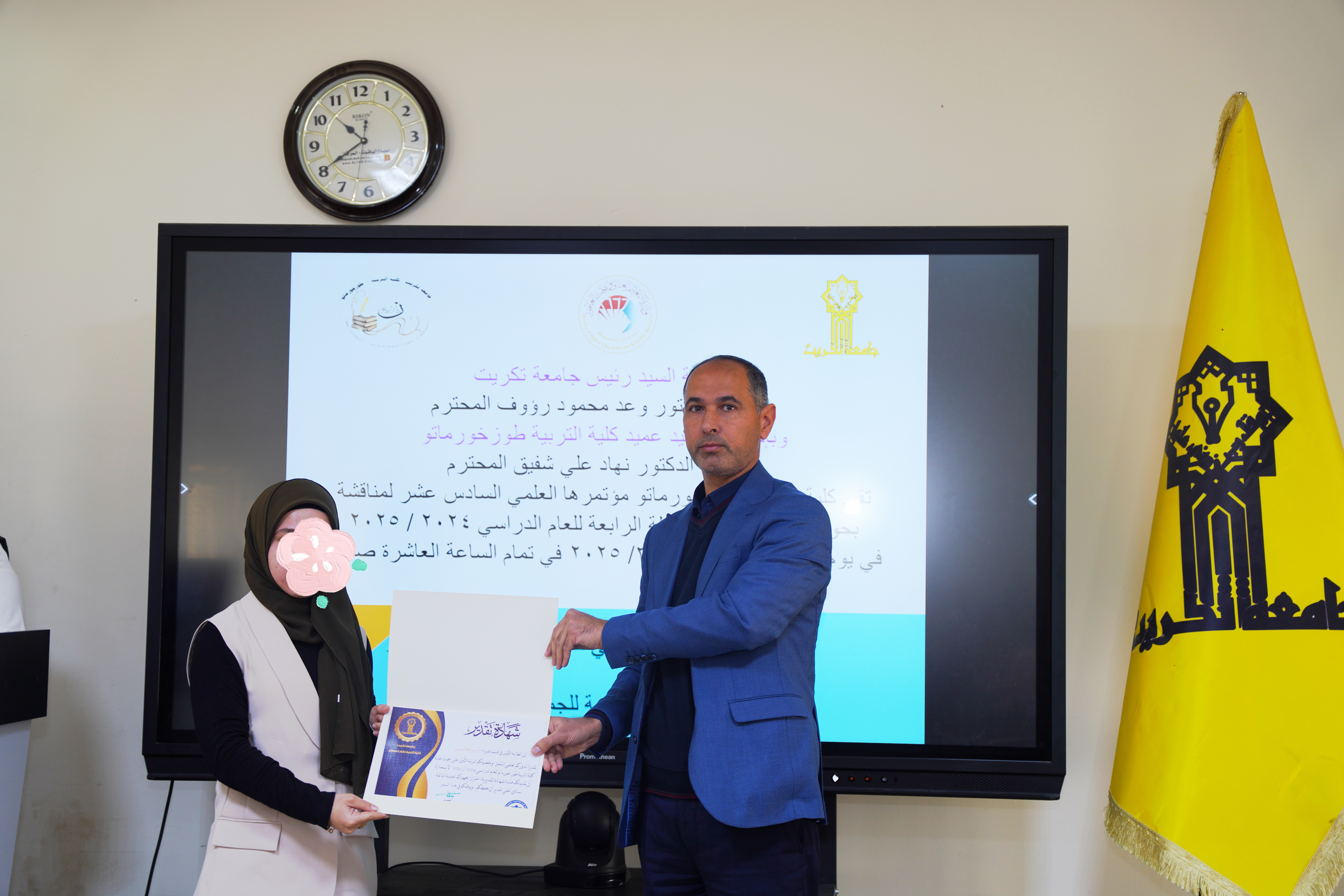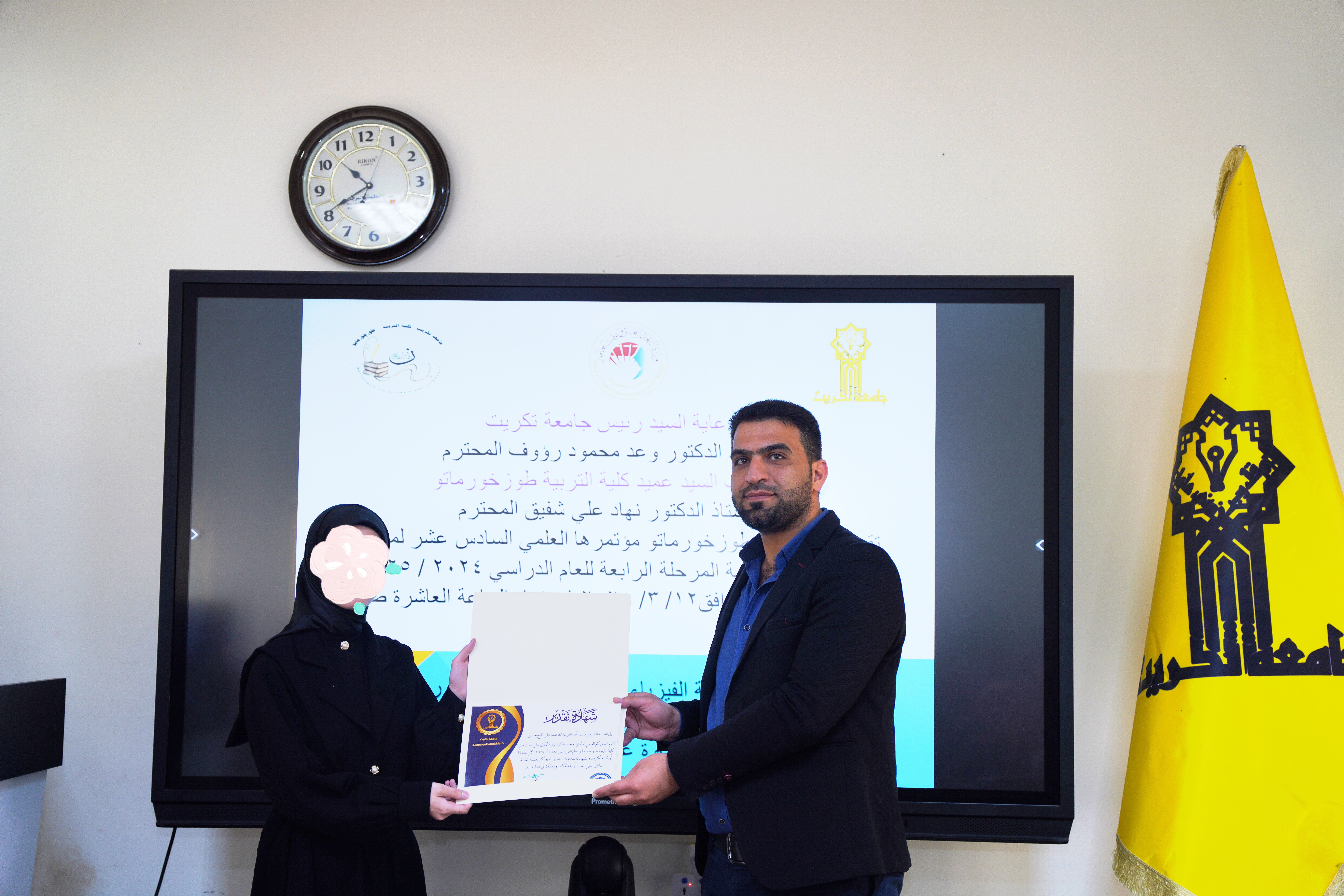 برعاية كريمة من رئيس جامعة تكريت الأستاذ الدكتور وعد محمود رؤوف، وبإشراف مباشر من عميد كلية التربية طوز خورماتو الأستاذ الدكتور نهاد علي شفيق، نظّمت الكلية اليوم الأربعاء الموافق 12 آذار 2025 حفلاً تكريمياً للطلبة أصحاب البحوث العلمية المتميزة في قسمي اللغة العربية والفيزياء.