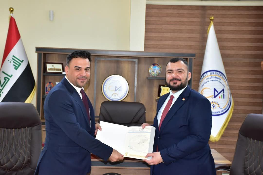 وفي ختام المناقشة، قدّم السيد عميد كلية علوم الحاسوب والرياضيات كتاب شكر وتقدير إلى الدكتور إبراهيم صالح أحمد، تثميناً لجهوده العلمية المتميزة في تقييم الرسالة.