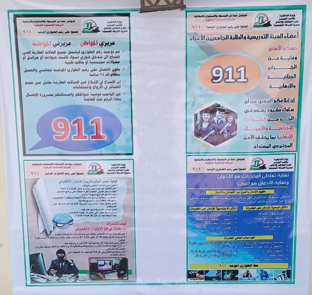 وتضمّنت الزيارة جولة في أروقة الكلية، حيث تم تعليق منشورات توعوية على جدران القاعات الدراسية، بهدف تعزيز وعي الطلبة ومنتسبي الكلية بضرورة الإبلاغ عن أي نشاط إجرامي أو إرهابي، وذلك عبر الاتصال بالرقم المجاني المخصص من قبل وزارة الداخلية (911).